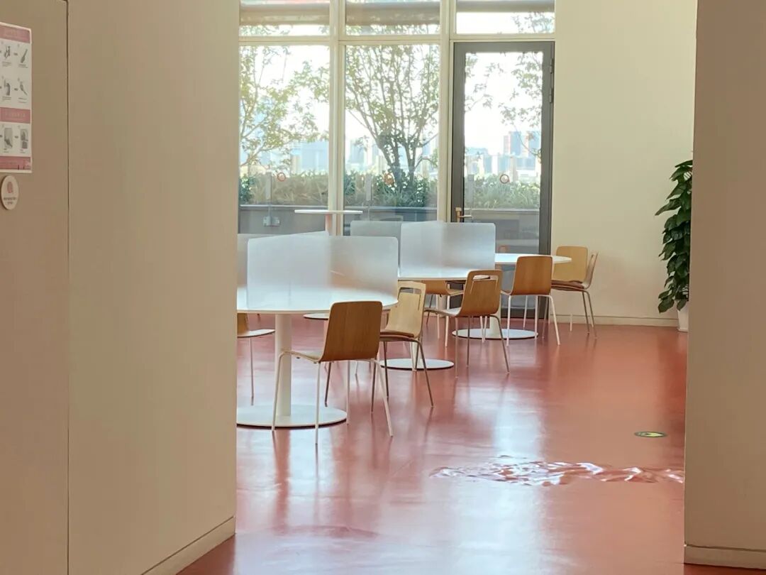 餐厅里还有疫情期间采用的单人就餐的设计。