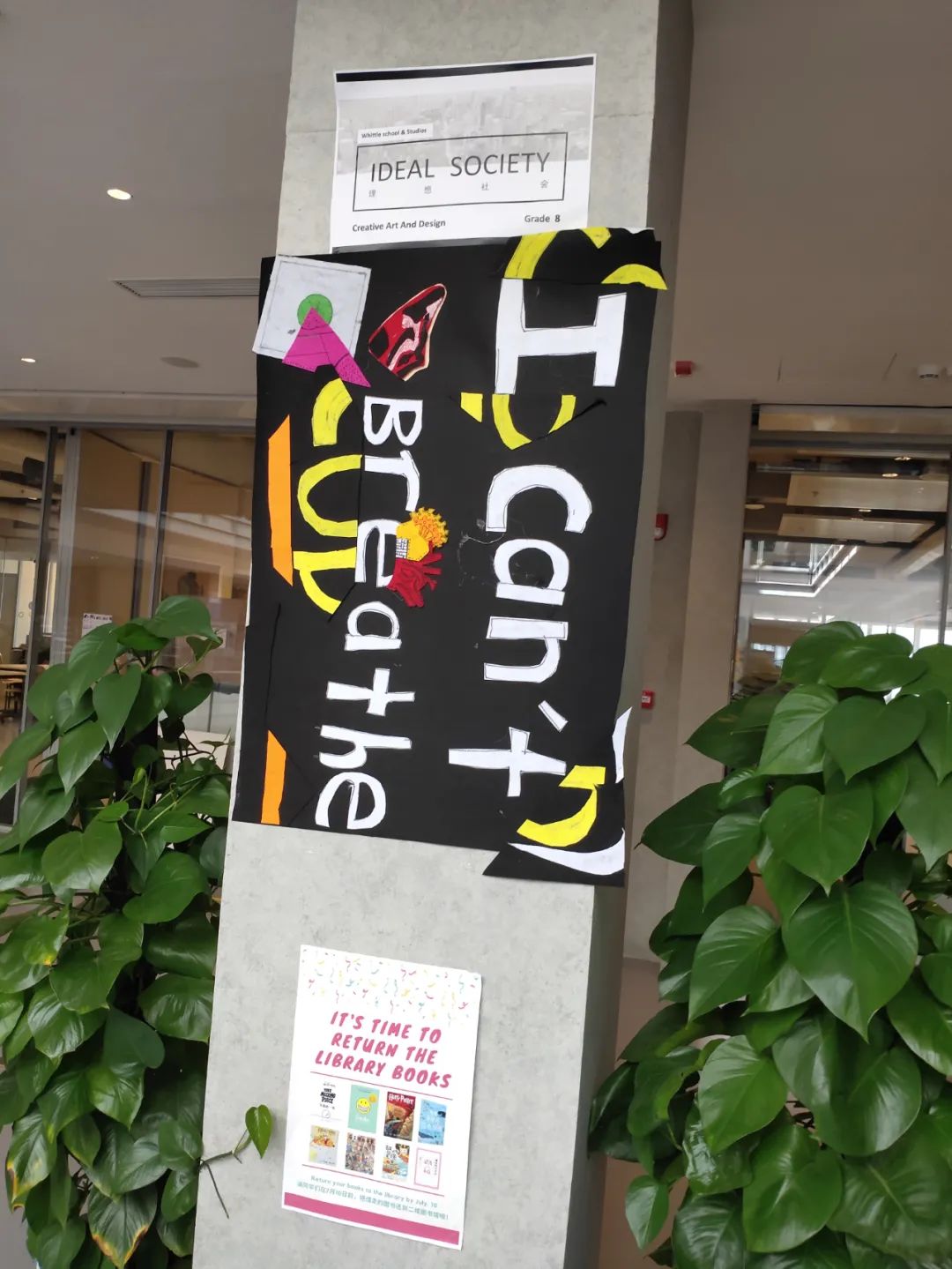 同学们精彩创意的画作展示在创作墙上。