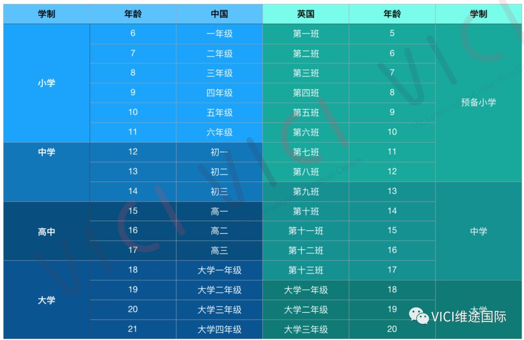 英国学制的第 1-8 年级相等于中国的小学到初中,称为「预备学校」(Preparatory School,简称 Prep School),9年级是不少中学的主要收生年,学生于第 10-11 年级完成会考课程,并于第 12-13 年级完成高考,考入当地甚至全球大学。