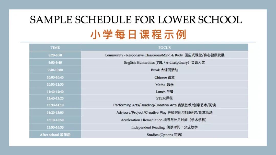 以中国义务教育课程标准(CCS)作为知识基础,同时采纳世界各地的最佳教学方法和原则,跟小学阶段教育理念是一样的。